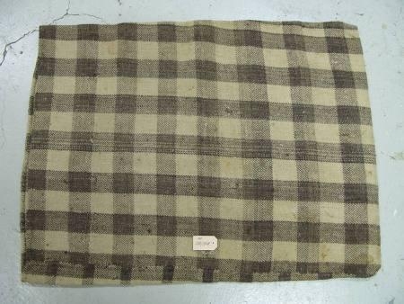 Brúnn togpoki úr köflóttu vaðmáli, líklega frá síðari hluta 19. aldar.