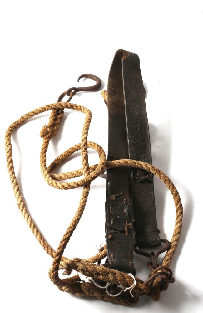 Dráttarbeisli, leðrið slitið og bætt, járnið ryðgað en kaðallinn heill. Til að festa aftan á aktygi. Frá Gilsárstekk í Breiðdal.