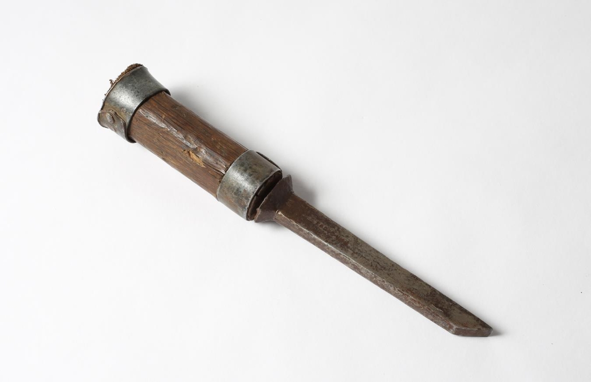 Heimasmíðað efnismikið sporjárn með tréskafti. Járnhólkar eru utan um skaftið. Úr búi Höskuldstaðaselsmanna; Eiríks, Einars, Gísla, Hóseasar og Marteins Björnssona, föður og föðurbræðra gefanda.