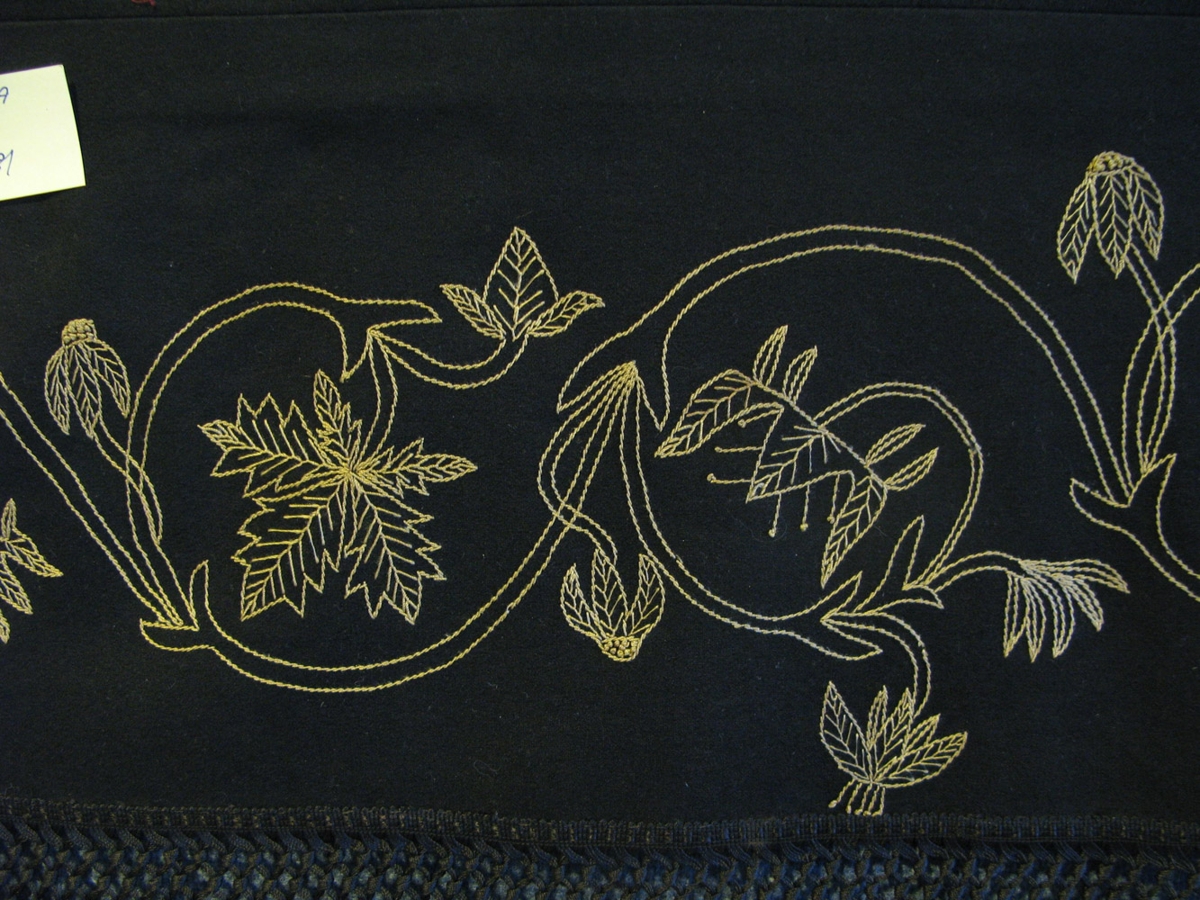 Hluti af svartri samfellu. Bekkurinn settur upp sem veggteppi með kögri. Samfellan var í eigu maddömu Guðríðar sem gift var sr. Vigfúsi. Hún var móðir Björgvins, sýslumanns á Efra-Hvoli. Maddama Guðríður gaf nöfnu sinni skautbúning þann er samfellan tilheyrði, um 1920. Nafnan, Guðríður Guttormsdóttir frá Stöð var móðir gefanda. Hún notaði samfelluna til að sauma föt á börnin, því fátæktin var mikil. Gaf dætrum sínum, Önnu og Pálínu sinn hvorn helminginn af bekknum. Anna hefur notað sinn helming sem veggteppi. Gefandi telur að maddama Guðríður hafi saumað bekkinn sjálf. Guðríður Jónsdóttir (f. 1841, d.1918) bjó á Ási í Fellum og var móðir Björgvins Vigfússonar sýslumanns. Bekkurinn er þá að öllum líkindum saumaður fyrir aldamótin 1800.