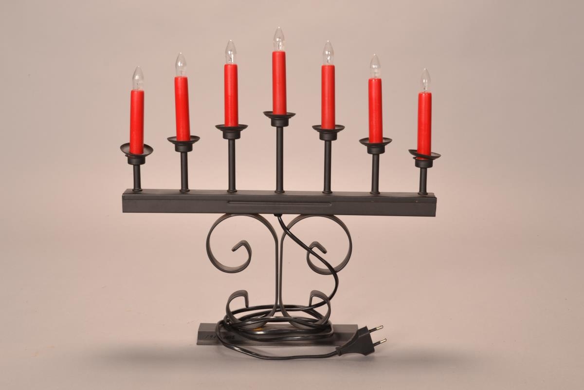Svart aðventuljós á einum fæti, 7 stjakar með rauðum rafmagnskertum í beinni röð