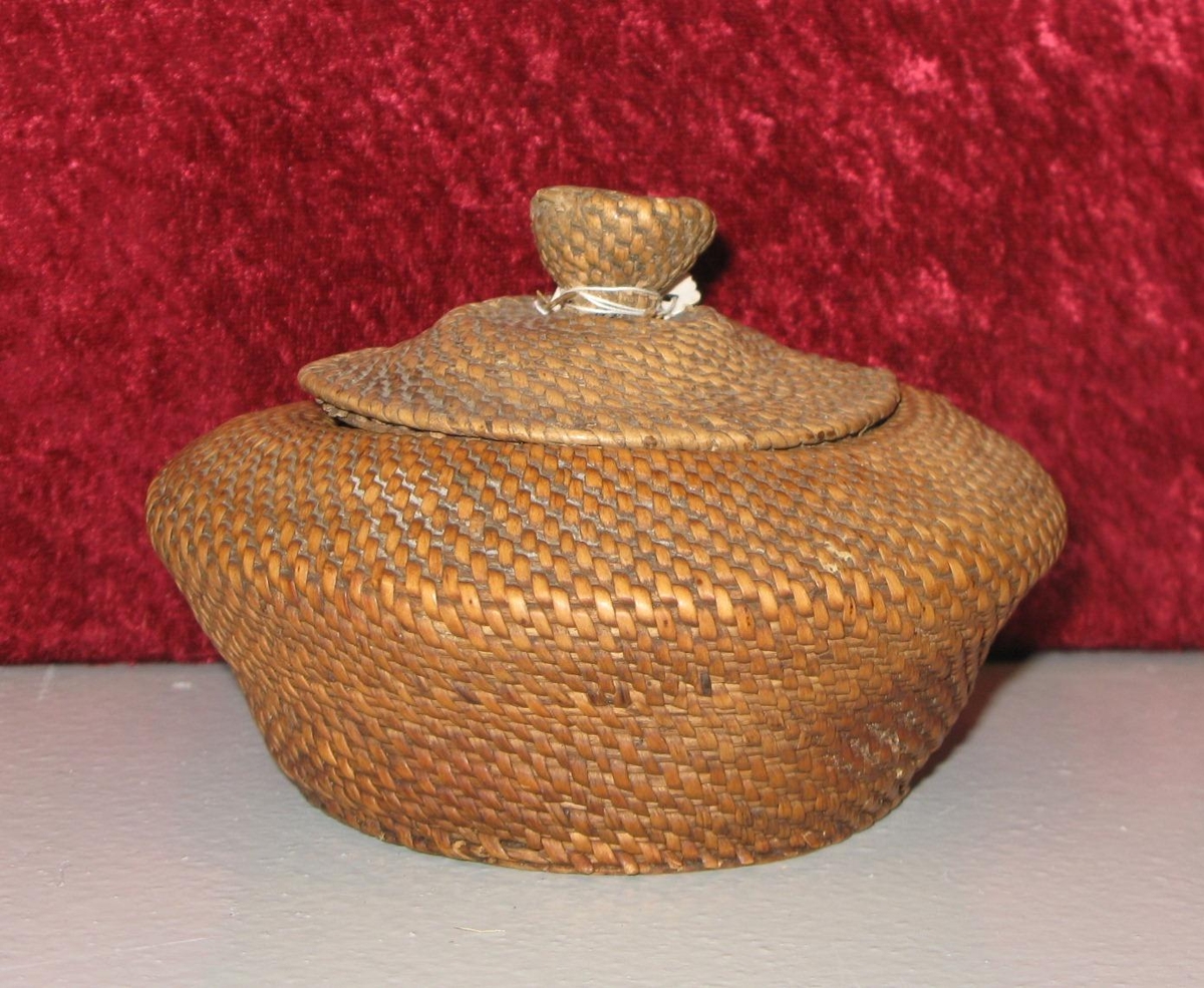 Tágakarfa með loki. Var notuð t.d undir ull og eða band o.fl. Karfan er riðuð af Jóni Jónssyni (f. 1887, d.1922) bónda á Þorgrímsstöðum í Breiðdal, en nærfellt á hverjum bæ í Breiðdal og nærliggjandi sveitum voru til slíkar tágakörfur eftir Jón og finnast víða enn í dag.