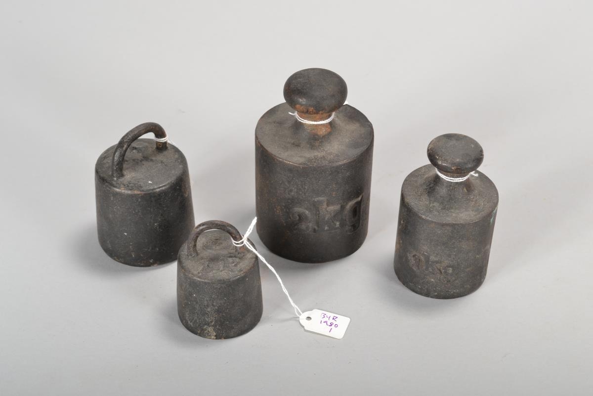 Borðvigtarlóð, eitt lóðið er 2 kg; eitt er 1 kg; eitt er 2 pund og eitt 1 pund. Lóðin eru úr „Kristínarbúð“, verslun Kristínar Guðmundsdóttur Túngötu 22, Keflavík
