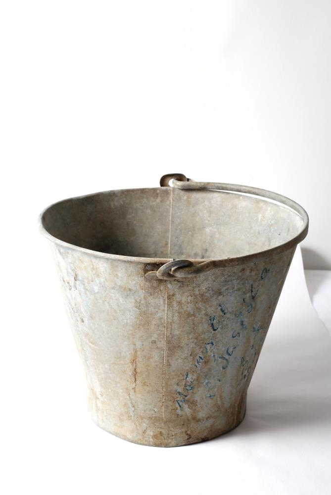 Skjóla/fata úr járni, sem á stendur með bláum stöfum "Mjólkurbúið Eiðum, Eiðaskóla". Starfsmenn Sorpu komu með til safnsins en ekki er vitað hver átti hana síðast.