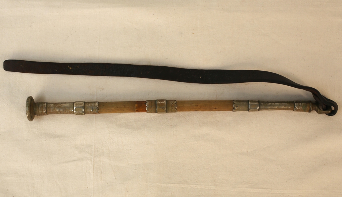 Silfurbúin, grafið í enda: "A.J.", fangamark Karls Antons Jónssonar, bónda Múla (f.27.11.1887, d.01.02.1962). Þrír hólkar laufaðir, munstraðir með riflum. Svipan var í eigu föður gefanda, Karls Antons Jónssonar bónda Múla.