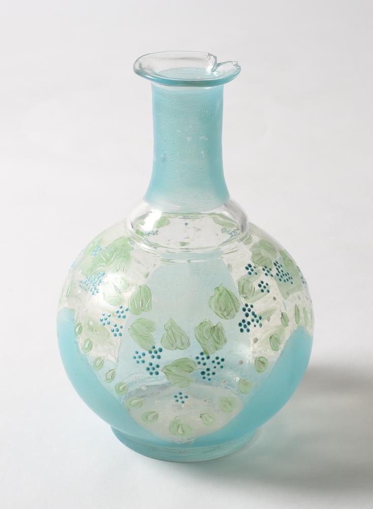 Kúlulaga flaska með stút, máluð með grænu og grænbláu mynstri, brotið úr stút. Notuð undir vatn handa næturgestum. Úr búi Karls Jónssonar á Múla. Annað heiti: Vatns karaffe.