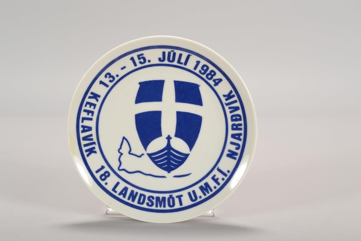 Hvítur postulínsdiskur með bláu letri og merki, áletrun „Landsmót UMFÍ, Njarðvík, Keflavík, 13.-15. júlí 1984“ , merkt á bakhlið: „Asl. Dóra og Stefán“