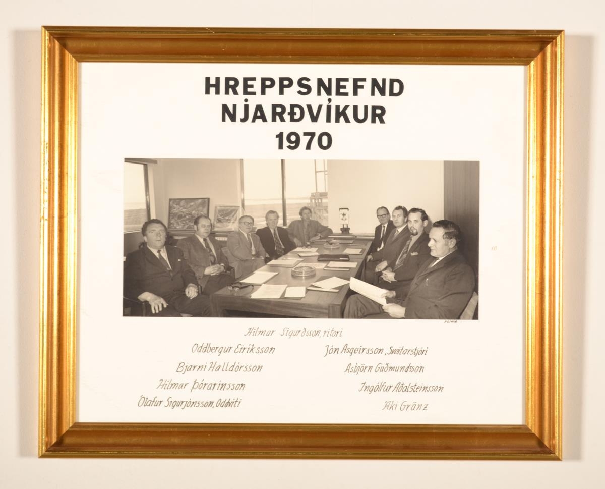 Innrömmuð svart/hvít ljósmynd af hreppsnefnd Njarðvíkur 1970