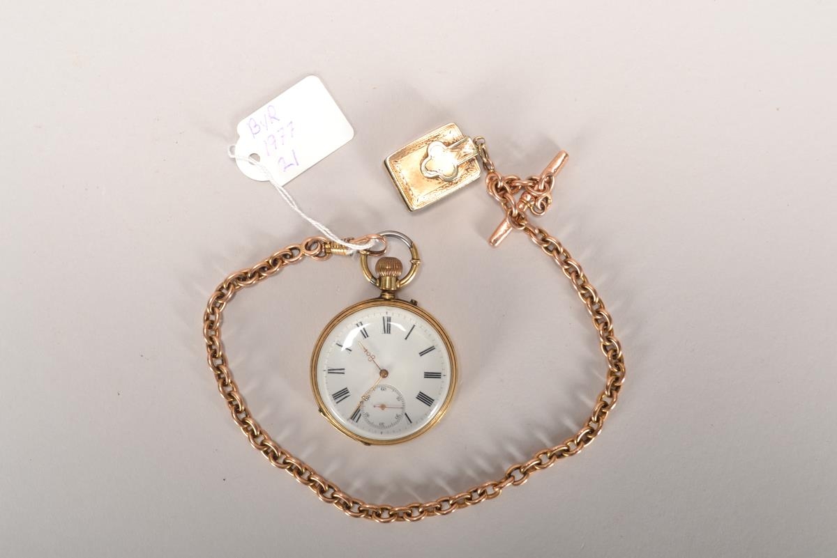 Gyllt karlmannsvasaúr með keðju, á hana er fest miniature myndaalbúm með 3 myndum af manni, konu og dreng, auk ónotaðra plássa.