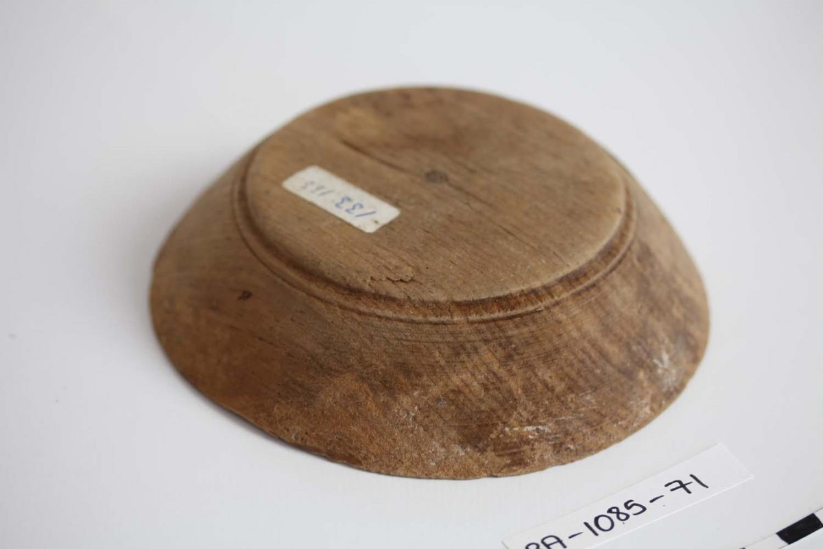Lítil tréskál, brotin og með trétappa í miðjunni. Rennd á botni.