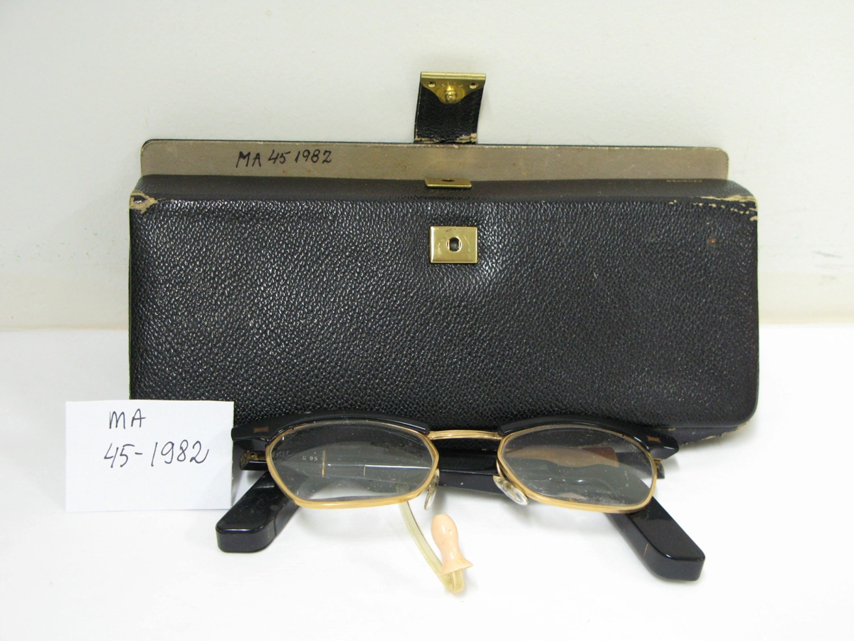 Gleraugu í svartri umgjörð með innbyggðu heyrnartæki fyrir annað eyrað. Í svörtu gleraugnahulstri úr leðurlíki. Meðfylgjandi er kassi undan kattartungum með batteríum og varahlutum fyrir heyrnatækið. Annar armurinn á gleraugnaumgjörðinni viðgerður með brúnum plasthólk. Guðný Jónsdóttir (f.1884 d.1973), fyrrum húsfreyja á Flugustöðum og Múla 2 í Geithellnahreppi. Átti gleraugu með heyrnatæki. Mun hafa eignast þessi upp úr 1960.