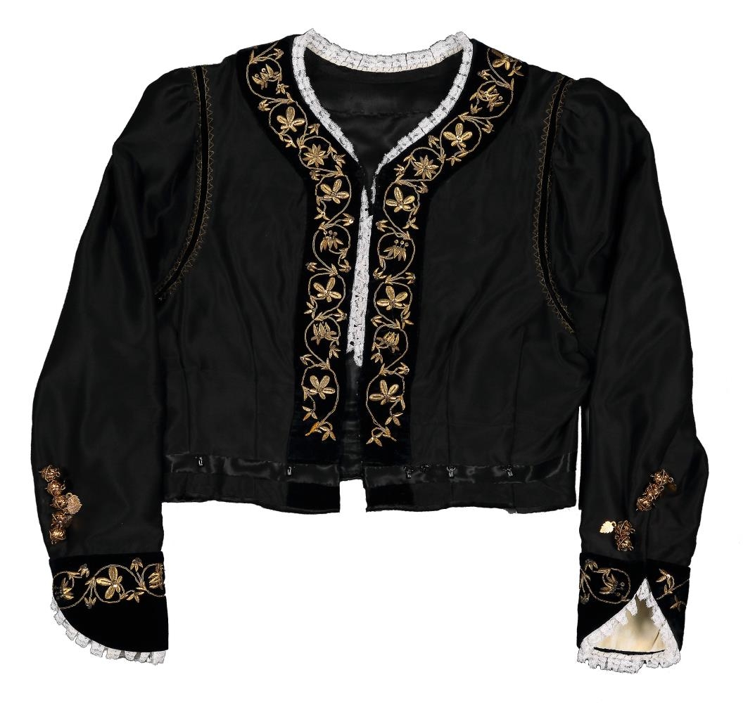 Skauttreyja úr svörtu satínefni eða silki. á boðungum, um hálsmál og fremst á ermum er svart eða svarblátt flauel. Boðungar eru baldýraðir blómamynstri úr gylltum vírþræði. Blómin í baldýringunni eru engjarósir (sjá mynsturteikningar og -skyssur Sigurðar Guðmundssonar málara: Þjms. SG:10:3). Á brúnum hálsmáls og fremst á ermum er hvít blúnda. Fremst á hvorri ermi eru fimm, gylltir hnappar með laufum. Ekki er vitað hver saumaði treyjuna.