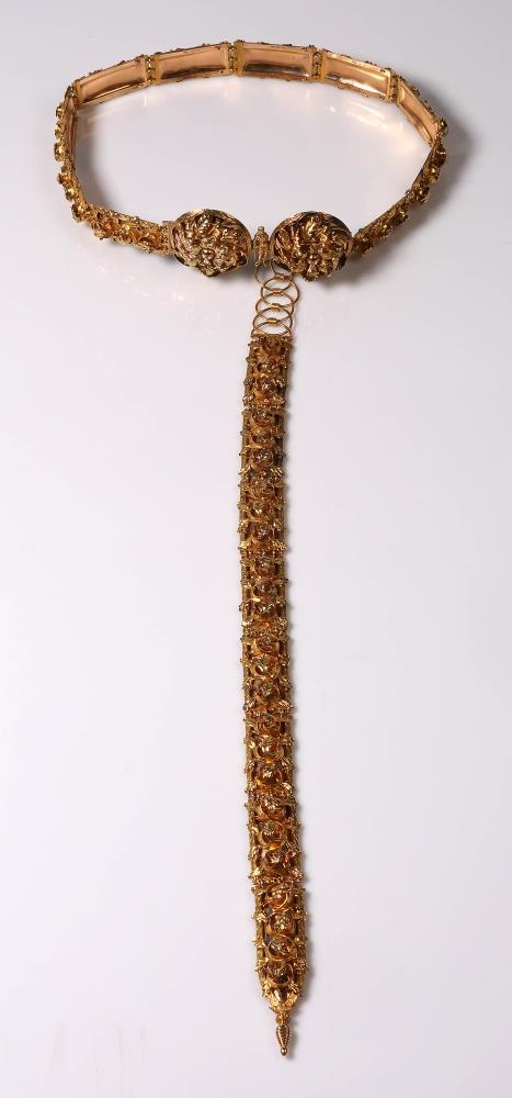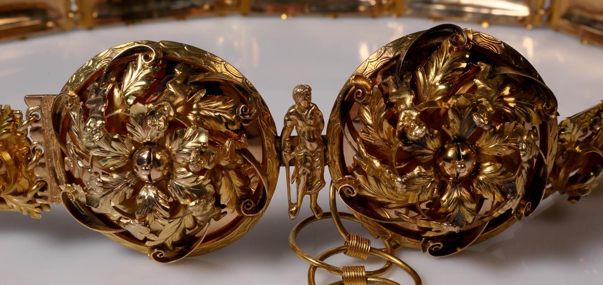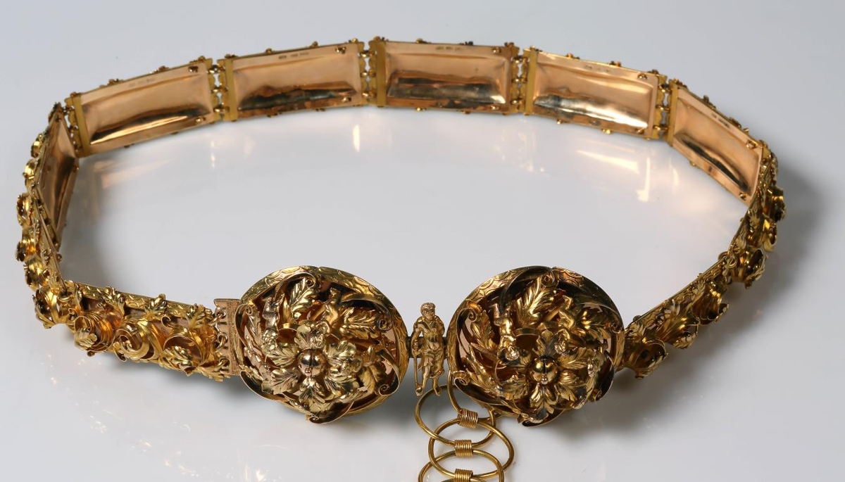 Sprotabelti (stokkabelti með sprota) úr 14 karata gulli með loftverki. Það er stimplað ME 14K EM á hvern stokk og á parasylgju. Upphafsstafirnir eru stafir feðganna Magnúsar Erlendssonar og Erlends Magnússonar en þeir ráku silfursmíðaverkstæði saman og stimpluðu flesta gripi með smiðsstimplum þeirra beggja. Á bakhlið beltisparanna er ártalið 1911. Það hefur því að líkindum verið Magnús sem smíðaði beltið því Erlendur lést árið 1909. Nema að smíðin hafi hafist löngu fyrr, þ. e. fyrir andlát Erlendar, og þeir feðgar báðir komið að smíðinni. Hið aldagamla handverk, loftverkið, hafði tapast niður í tímans rás en Erlendi hafði áskotnast beltisstokkur með loftverki. Hann rakti stokkinn upp og fann þannig út með hvaða hætti hann gæti smíðað gripi eftir honum. Beltinu fylgir ílangur, póleraður viðarkassi, fóðraður, sem beltið var geymt í. Á lokinu eru upphafsstafir Margrétar Þorbjargar Jensen og dagsetningin 21.5.1911, inngreypt með gylltum stöfum. Sjá einnig sprotabelti nr. Þjms. 2012-13-7. Síðar hafa fleiri smíðað skart með loftverki.
