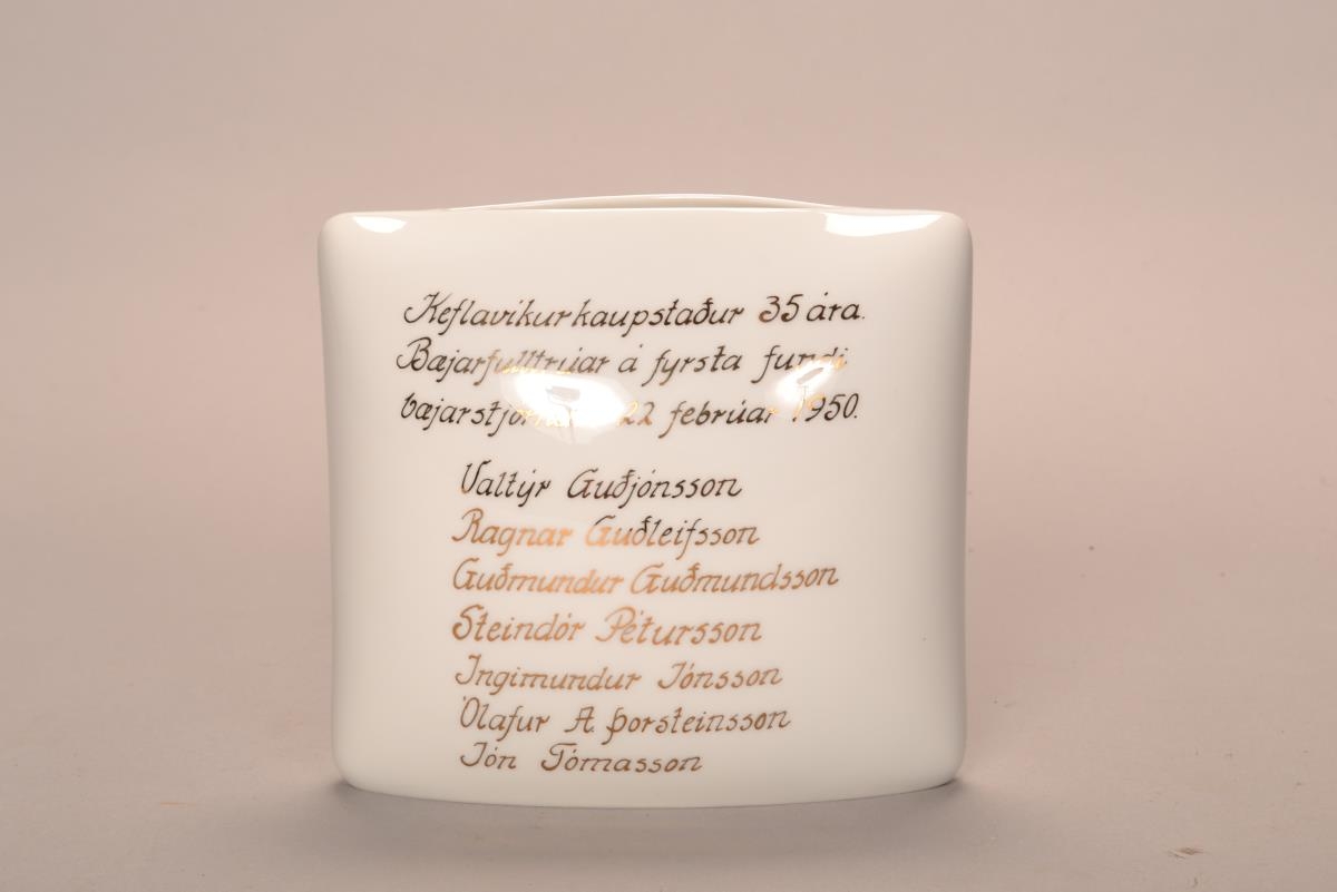 Hvítur ferkantaður postulínsvasi merktur: „Keflavíkurkaupstaður 35 ára, bæjarfulltrúar á fyrsta fundi bæjarstjórnar 22. febrúar 1950“ og nöfn sjö bæjarfulltrúa.