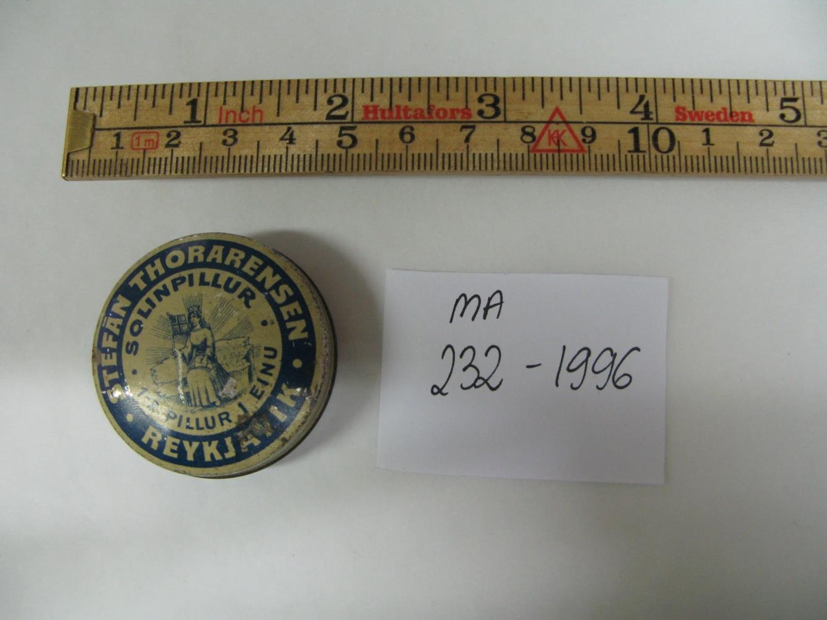 Áletrun á loki: "Stefán Thorarensen, Reykjavík. Solinpillur. 1-2 pillur á einu." Gefandi fann boxið að Barónsstíg 49 í Reykjavík þegar verið var að flytja úr húsinu eftir að eigandi þess lést.