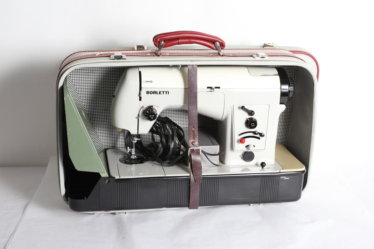 Grá Borletti saumavél mod. 1102 FB 114. Keypt á árunum 1963-1964, var mjög dýr og fullkomin vél er hún var keypt. Er í grárri tösku. Rafmagnssnúru vantar. Aukahlutir: þrír fætur og spóla. Grænt bretti úr annarri vél (FB 115) fylgir. Kennslutæki frá Húsmæðraskólanum á Hallormsstað. Made in Italia.