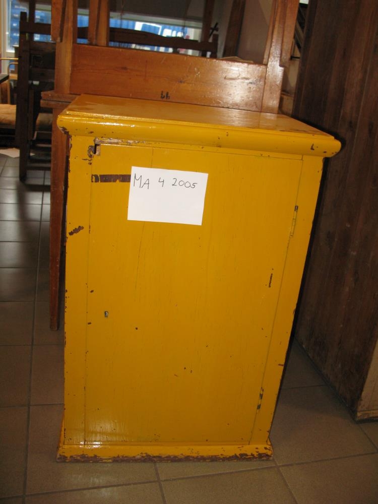 Gulmálaður tréskápur. Var í upphafi brúnbæsaður. Kom frá Hússtjórnarskólanum á Hallormsstað. Var keyptur eftir endurbætur á skólahúsinu árið 1954. Stóð lengst af inni á skrifstofu undir brjóstmynd af Ingvari Pálmasyni. Framleiðandi: Valbjörk, Akureyri.
