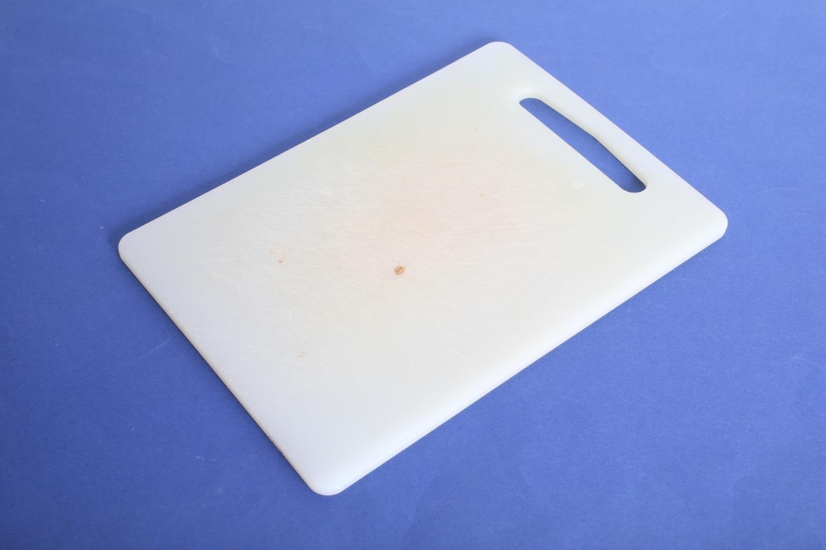 Hvítt skurðarbretti. Til að skera á. Kom frá Hússtjórnarskólanum á Hallormsstað. Framleiðandi: IKEA.