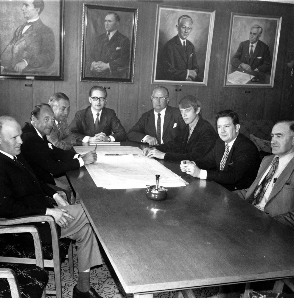 Fundur um byggingu nýs mjólkursamlags, fulltrúar KEA með erlendum samstarfsaðilum. Teikningar á fundarborði. Byggingarnefnd mjólkursamlagsins.