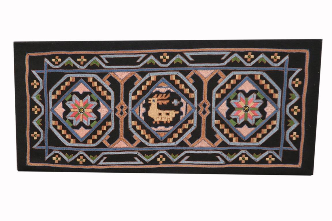 Útsaumað veggteppi. Svartur ullarjafi í grunni, ullargarn mörgum litum.