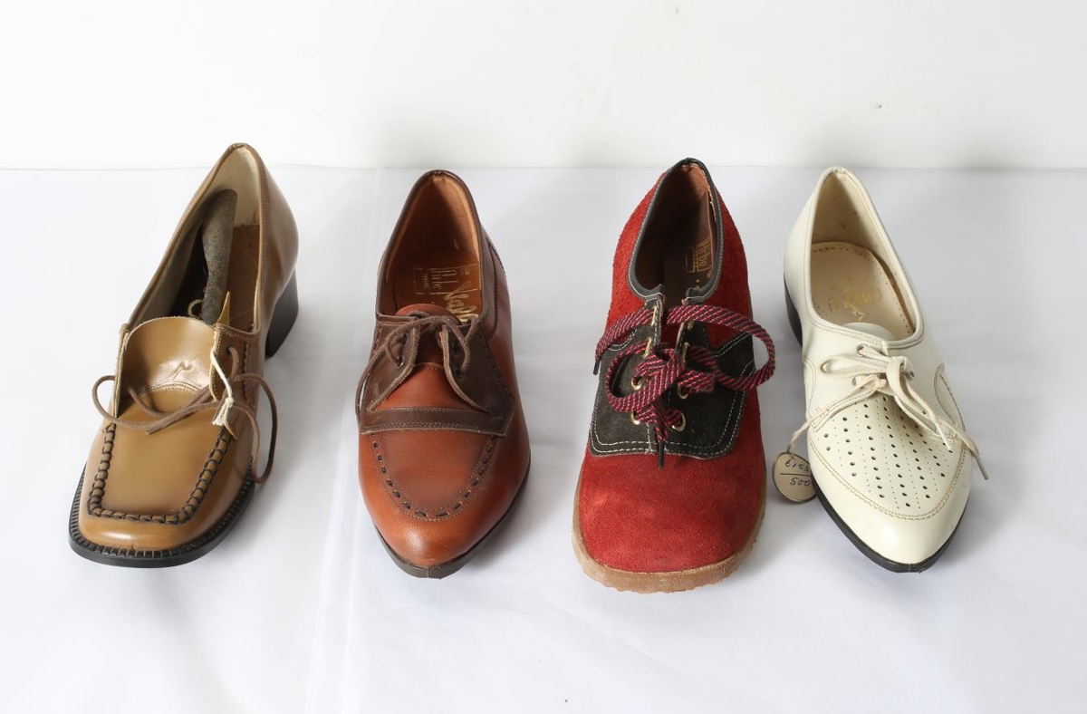Fern pör af kvenskóm. a) Hvítir nr. 3 1/2; b) Brúnn nr. 3 1/2; c) Brúnn nr. 4;