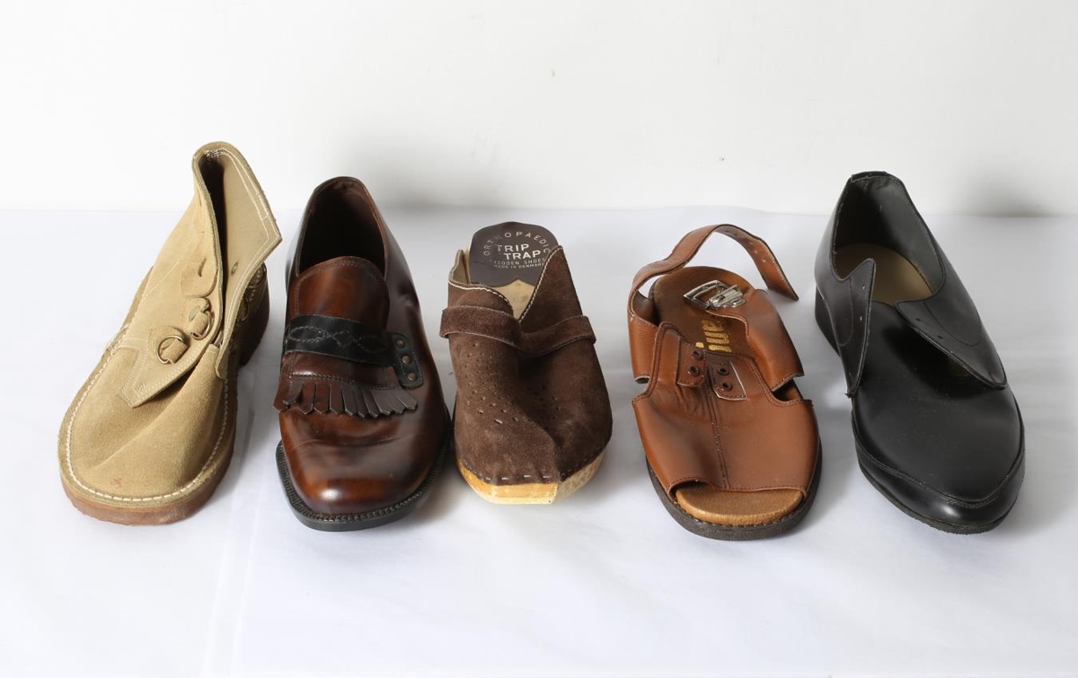Fimm karlmannsskór. a) Brúnn skór; b) Svartur skór nr. 10 1/2; c) Drappaður rúskinnsskór; d) Brúnn tréklossi, nr. 40; e) Brúnn inniskór/sandali nr. 42. Úr þrotabúi skóverksmiðjunnar Agilu Egilsstöðum er starfaði á árunum 1970-1975. Framleiðandi: Agila.