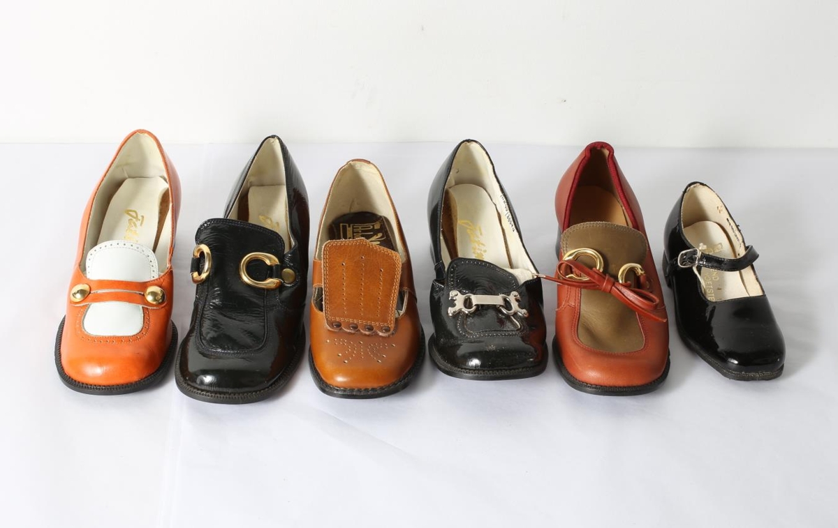 Sex telpnaskór. a) Appelsínugulur skór nr. 33; b) Brúnn skór nr. 27/36; c) Brúnn skór nr. 33; d) Svartur skór, nr. 33; e) Svartur skór nr. 33; f) Svartur skór nr. 25. Úr þrotabúi skóverksmiðjunnar Agilu Egilsstöðum er starfaði á árunum 1970-1975. Framleiðandi: Agila.