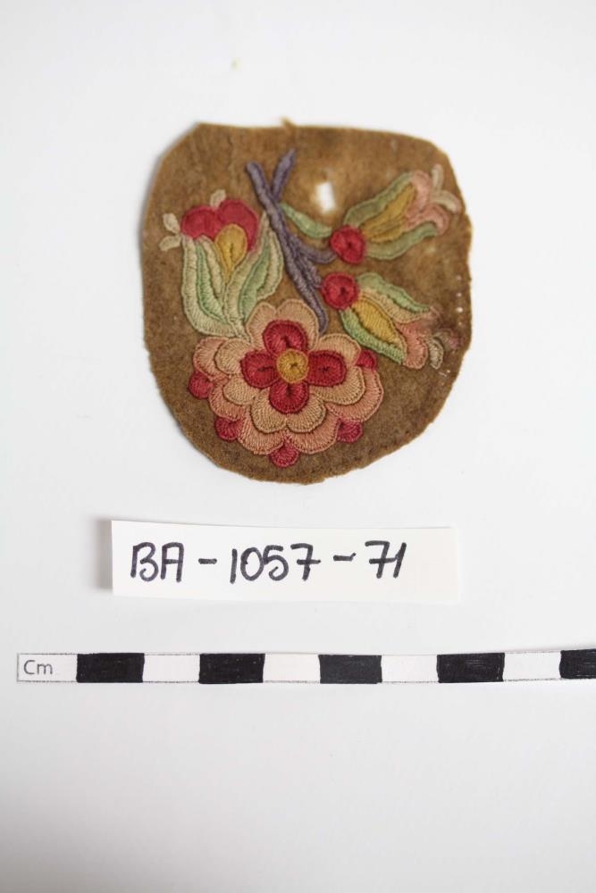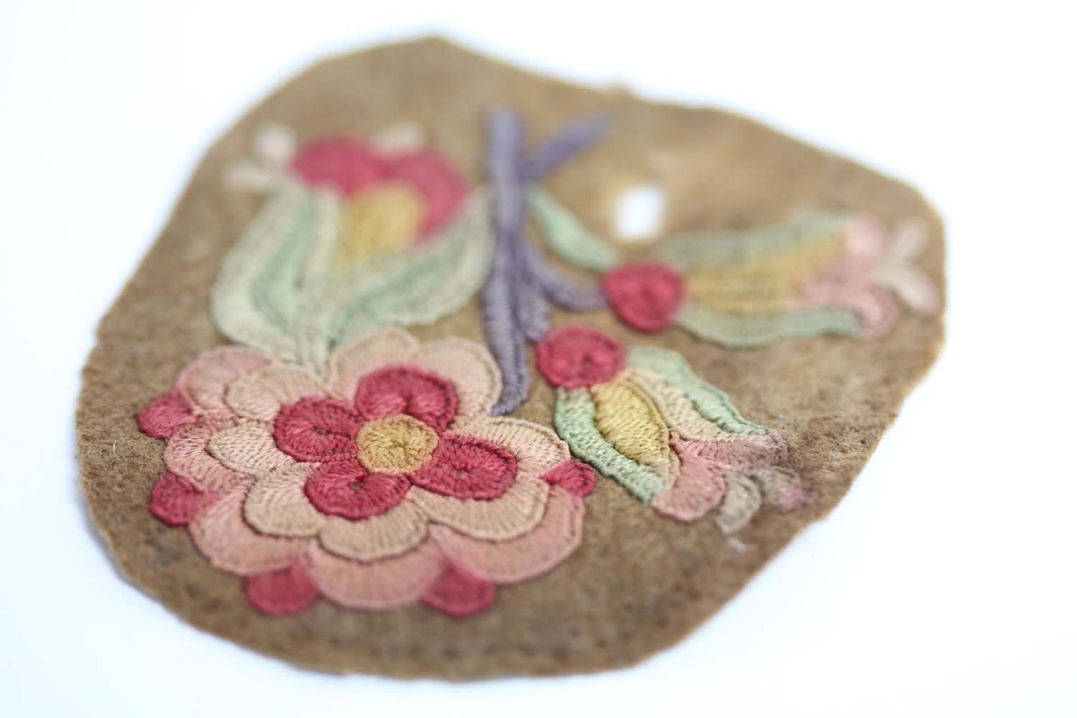 Bókamerki, útsaumað með blómamynstri. Saumað á þæfða ull. Farið að láta á sjá, örlítið gat komið á ullina.
