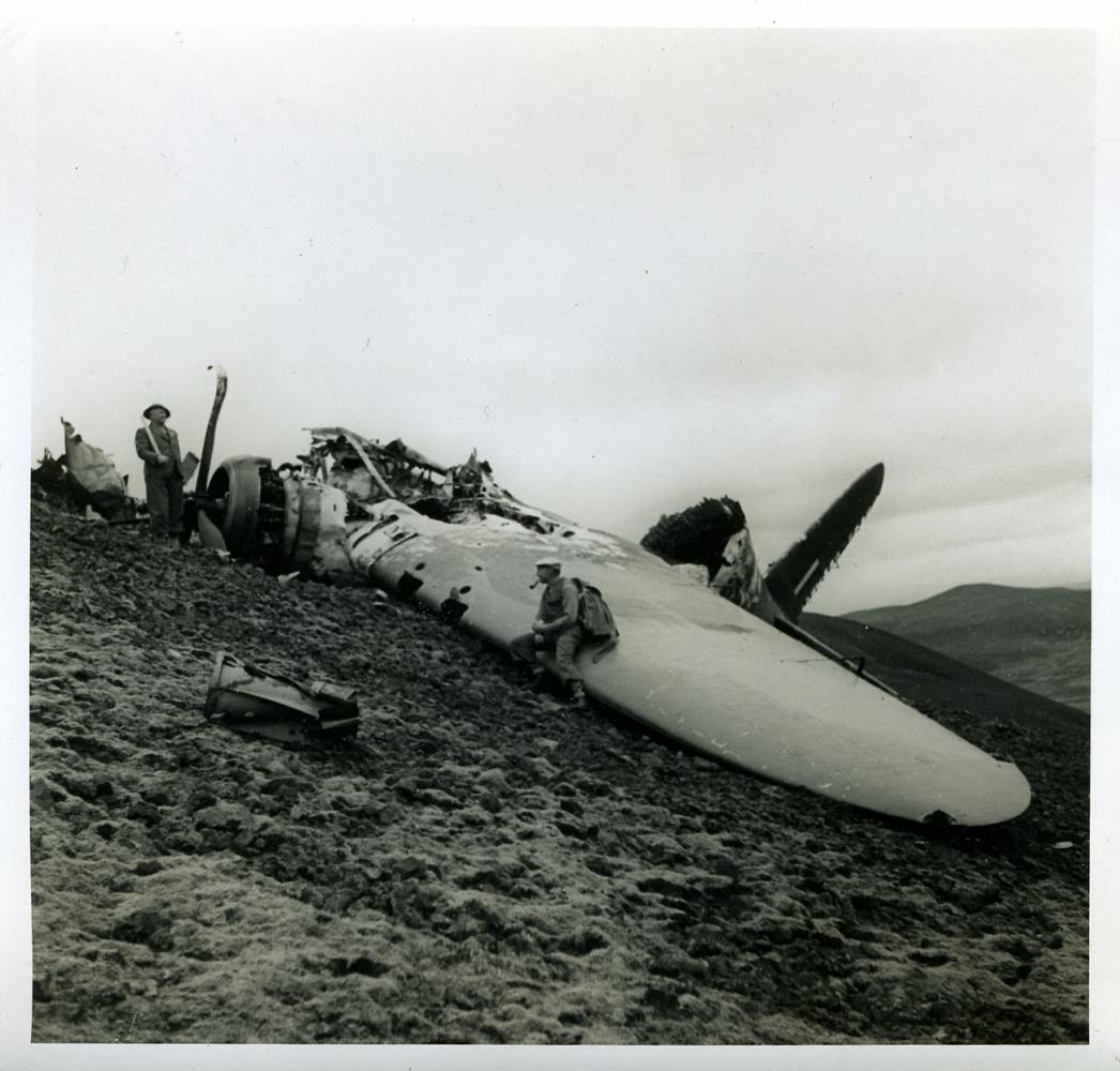 Tveir hermenn við flak allstórrar flugvélar í fjallshlíð. Á bakhlið er skrifað: Í Fagradalsfjalli. Stimpill ljósmyndara: Svavar Hjaltested Reykjavík.