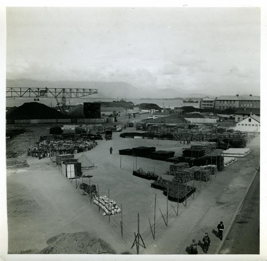 Birgðasvæði setuliðsins í austurhöfninni, í baksýn t.v. er Kolakraninn og t.h. Sænska frystihúsið. Á bakhlið er skrifað: Herbirgðir við Rvíkurhöfn. 121. mynd. Stimpill ljósmyndara: Svavar Hjaltested Reykjavík.