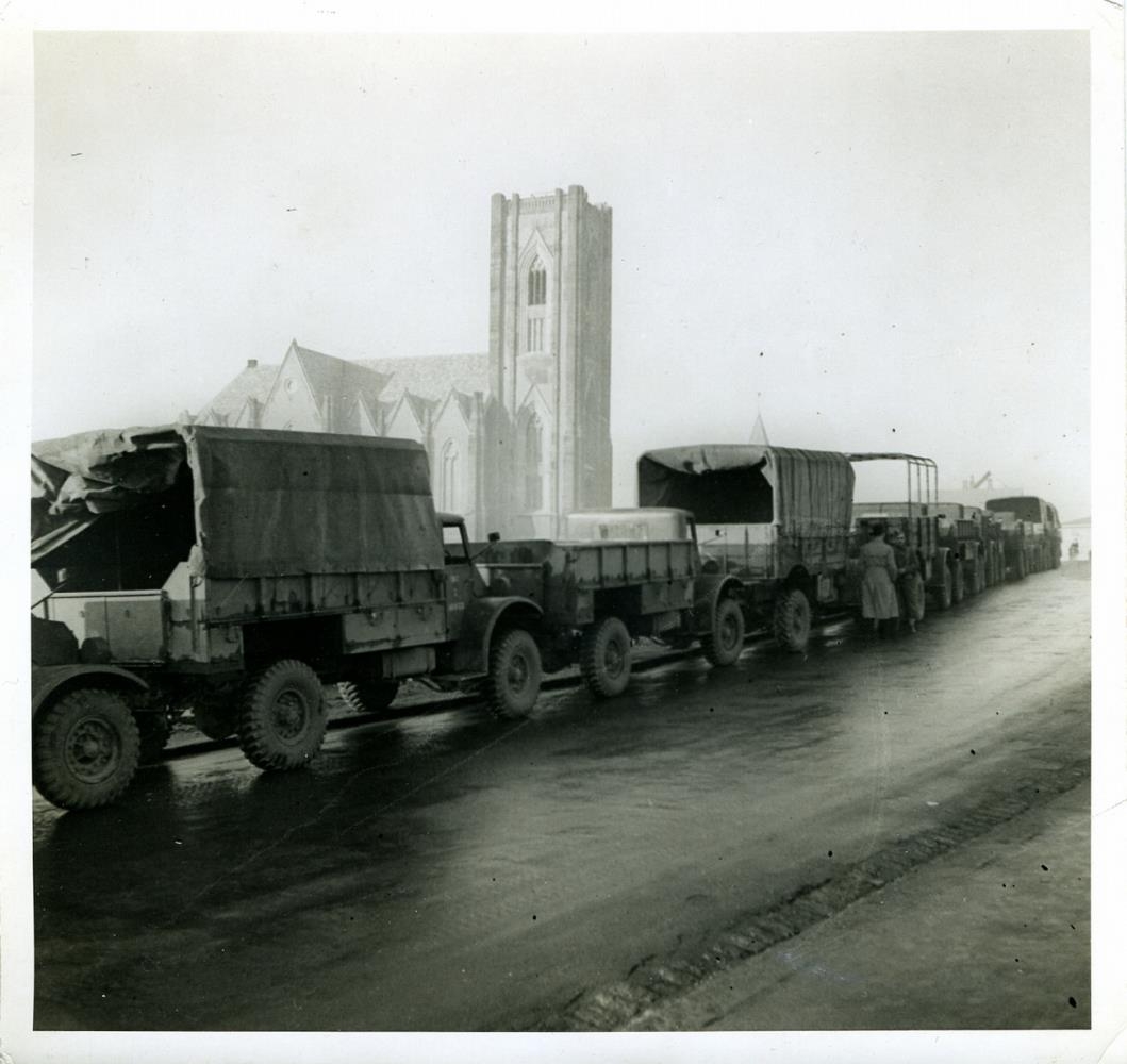 Breskir herbílar í röð á öfugum vegarhelmingi í Túngötu, í baksýn er Landakotskirkja. Á bakhlið er skrifað: Herflutningabílar á Túngötu. 38. mynd. Stimpill ljósmyndara: Svavar Hjaltested Reykjavík.
