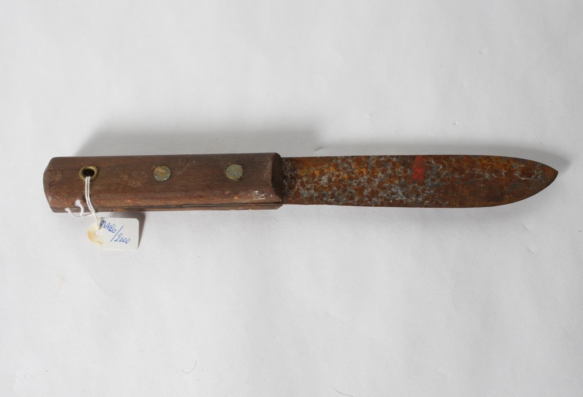 Ryðgaður hnífur með tréskafti. Kemur úr dánarbúi Arthúrs Guðnasonar frá Sólbergi á Reyðarfirði.