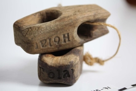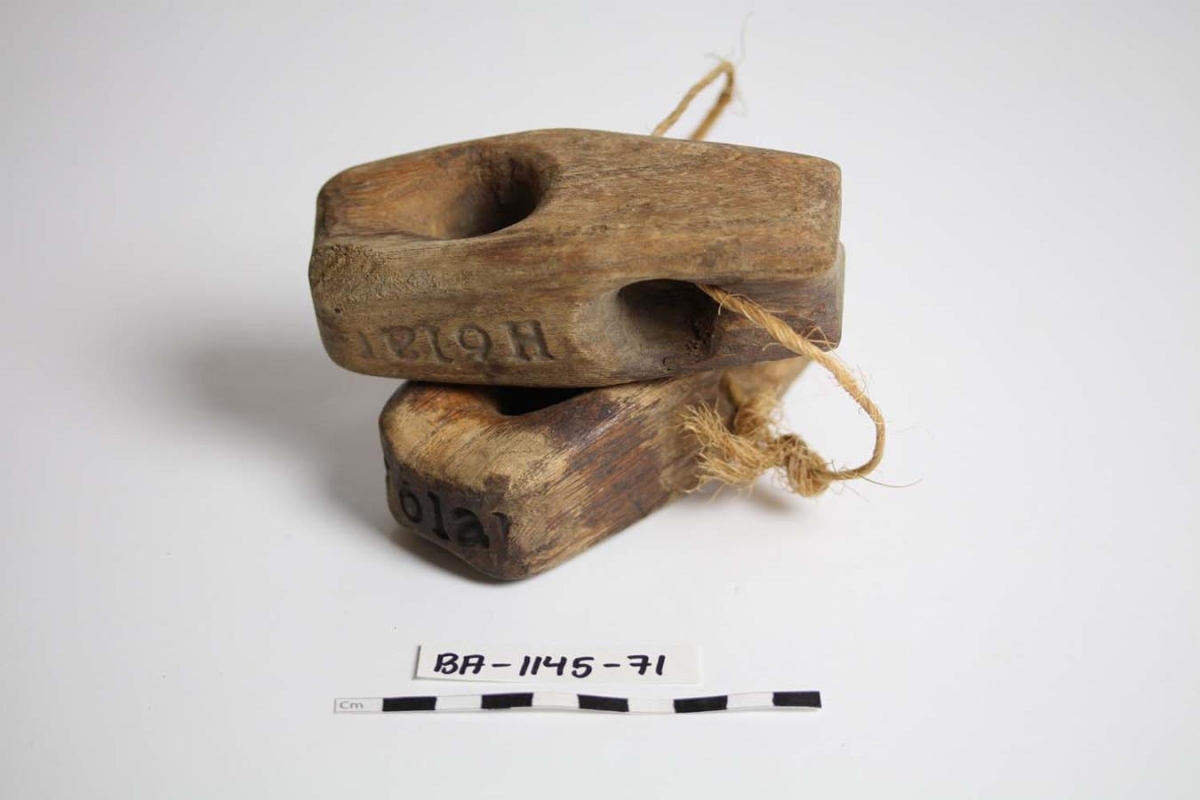Tvær viðarhagldir brennimerktar Hólar. festar saman með reipi.