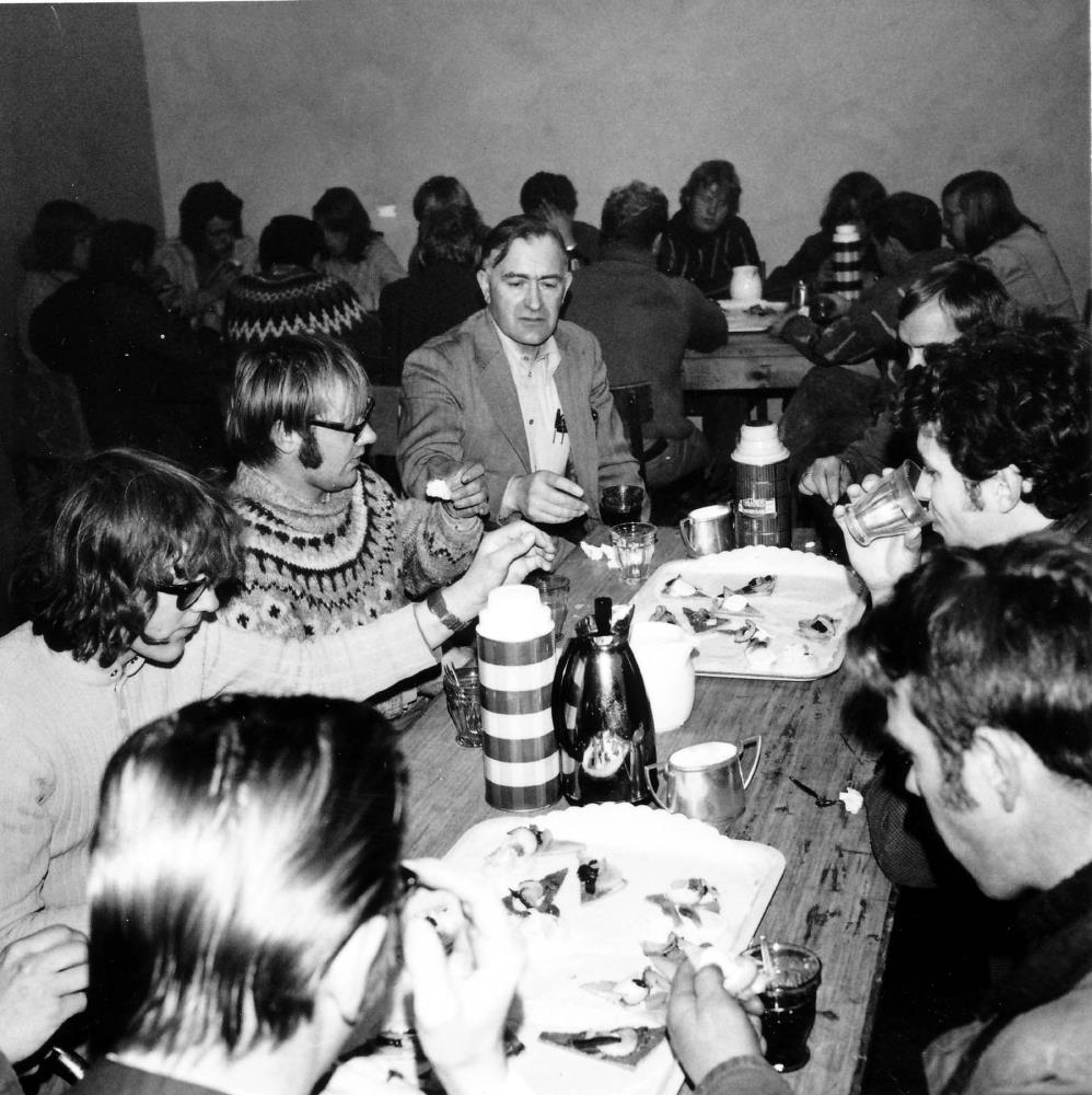 Byggingameistari og kaupfélagsstjóri bjóða uppá smurtbrauð með kaffinu, við byggingu Vöruhúss KEA.