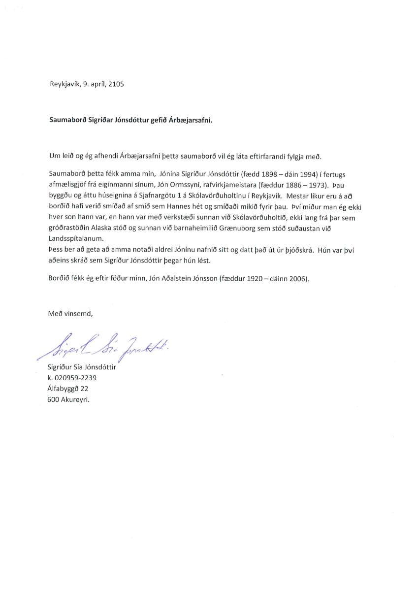 Saumaborð. Undir borðplötunni eru hólf með lokum fyrir smáhluti. Neðan á plötu eru innfelldir upphafsstaðir eiganda og ár: J.S.J. 1898-1938.