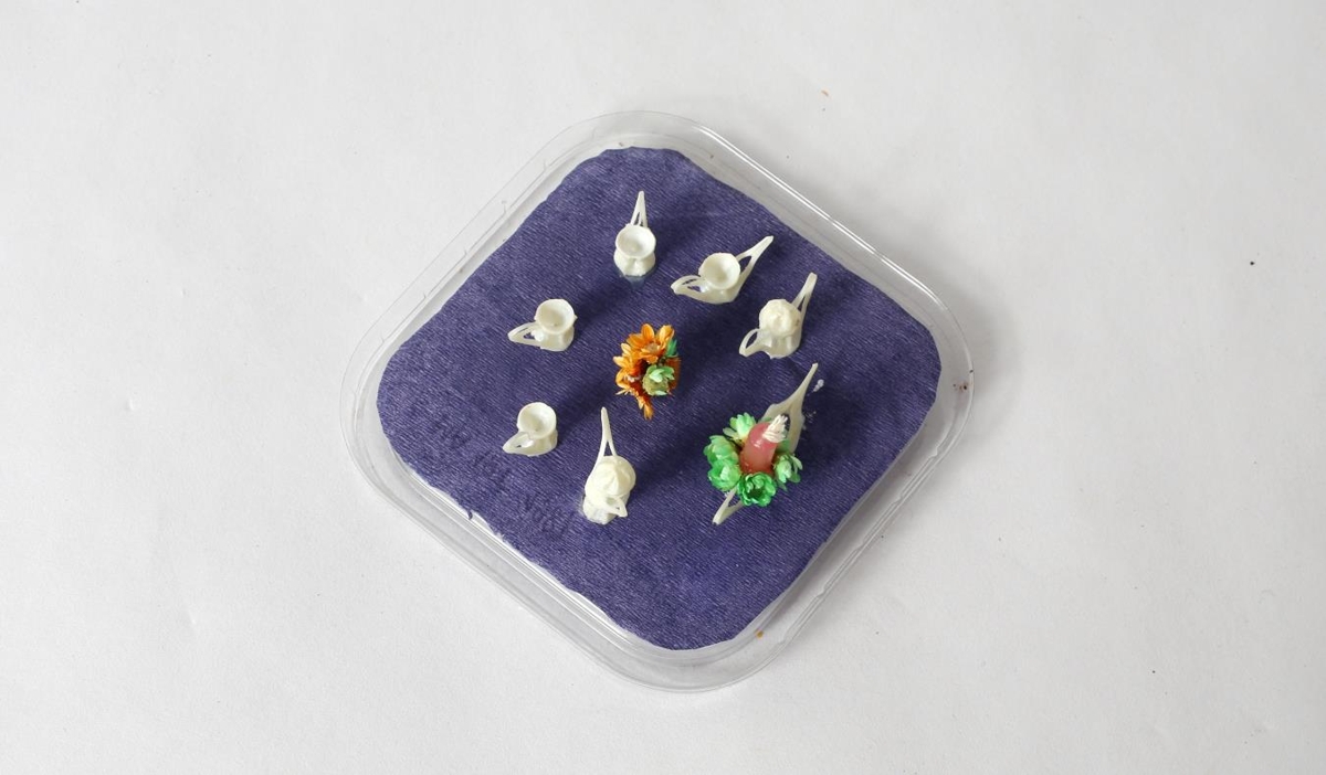 Skreyting í glæru boxi. Eiga að vera bollar og könnur og svo er rautt kerti með grænum blómum í kring og gul blóm í vasa. Blár grunnur. Ílátið farið að losna innan í boxinu. Systir Guðmundar frá Lundi, Guðbjörg Þorsteinsdóttir gerði.