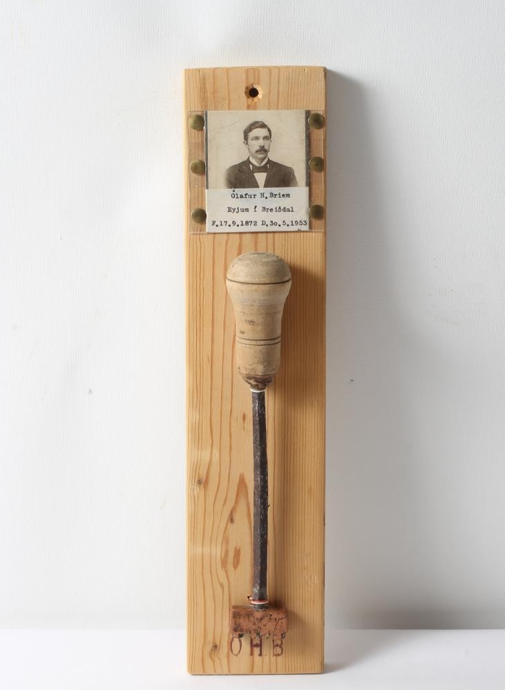 Heimasmíðað brennimark. Úr kopar á járnstöng með renndu tréskafti úr birki. Fest á fjöl ásamt mynd af eiganda, Ólafi Briem (f. 17.09.1872 d. 30.05.1953). Úr einkasafni Haraldar Ólafssonar.