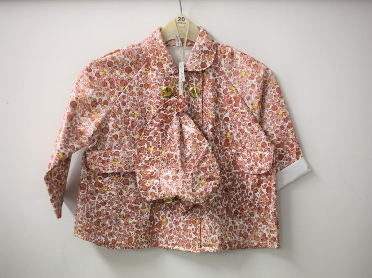 Regnkápa á barn og regnhattur í stíl. Gefandi gaf syni sínum í kringum 1975. Ekki mikið notað ef eitthvað. Mjög líklega úr Verslunarfélaginu fyrir norðan Fljót.