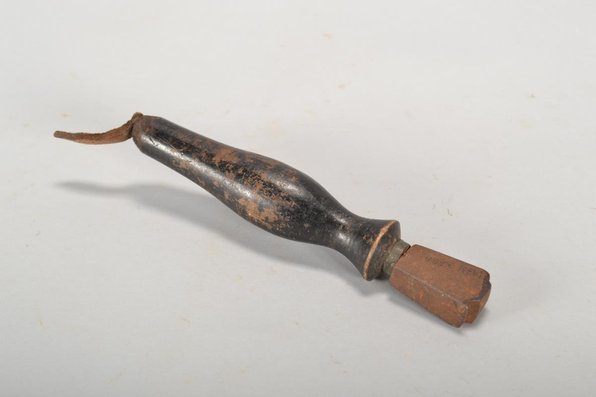 Glattjárn var notað til að nudda leðrið og fá þannig eðlilegri áferð. Efni: járnhaus, viðarskaft og leðurhanki.