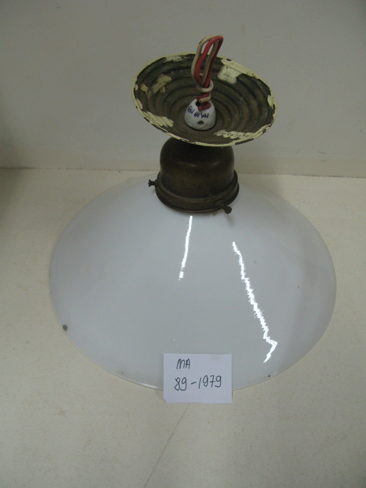 Loftljós, hvítur postulínsskermur, einfaldur að gerð, festur á koparstykki með þremur skrúfum sem þrengja að honum. Hringur ofan á koparstykkinu. Hirt í Framsókn á Reyðarfirði 18.sept 1979. Mun vera samskonar og elstu rafmagnsljós á Eskifirði.