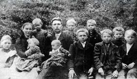(Tvær ljósmyndir) Guðlaug Brynjólfsdóttir og Úlfar Jónsson frá Fljótadal í Fljótshlíð með 10 elstu börnin 1904. Ágúst afi er 2. frá hægri.