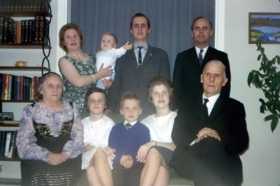 Mynd til vinstri: Á Sogaveginum 1963, aftari röð, Oddrún, Sigurður Hreinn, Ágúst Úlfar, Sigurður Þórir Ágústsson. Fremri röð, Sigrún amma, Sigrún Lóa, Páll Ragnar, Halldóra Sunna og Ágúst afi.