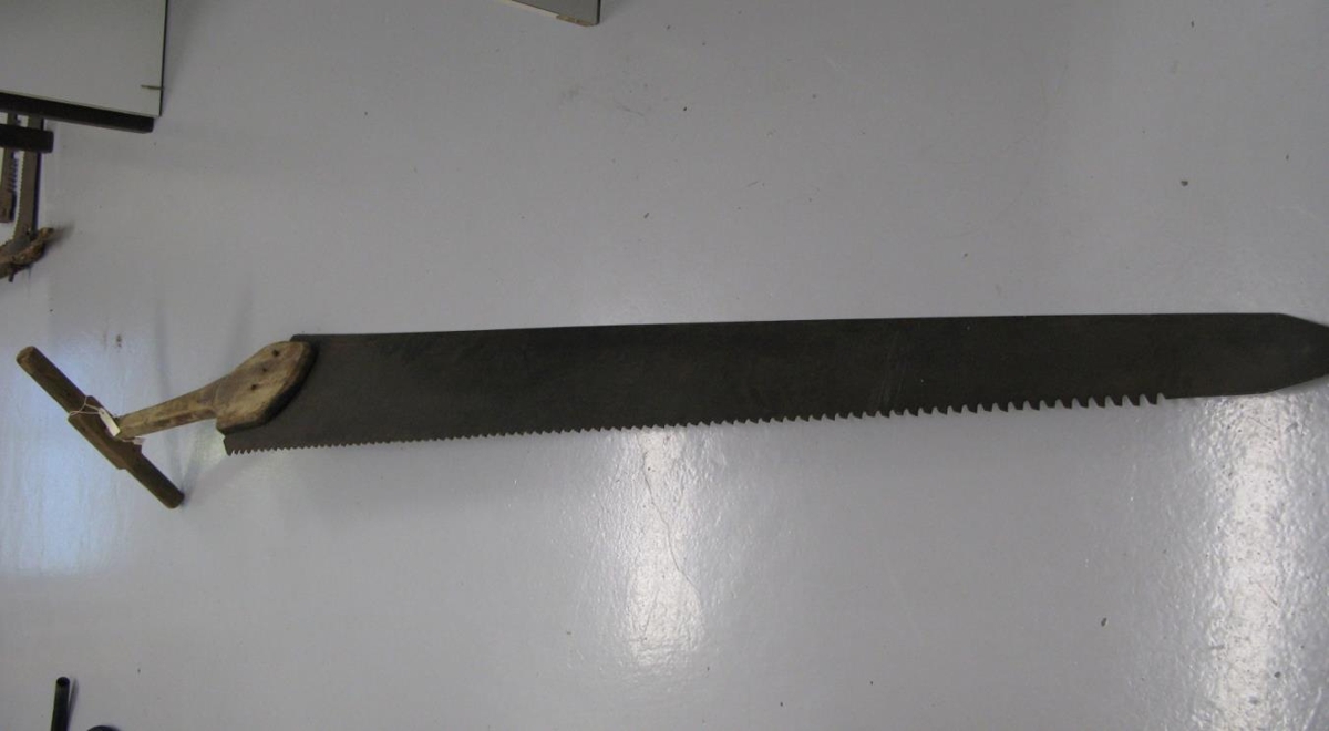 Stórviðarsög úr við með járnblaði í miðju og handföng sitthvoru megin. Kom inn 1985 en var ekki merkt eða skráð. Skv. aðfangabók stendur; stórviðarsög frá Stefáni Jónssyni Núpi. Gekk á milli rekajarða. Tveir unnu saman við að saga og þurfti fleiri við til að skiptast á við að saga því verkið var þreytandi.