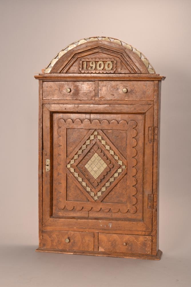 Útskorinn skápur úr tré með mörgum skúffum og smáhólfum, merktur „1900“. Er upprunninn í Skagafirði en kom til Keflavíkur með Steindóri Péturssyni,