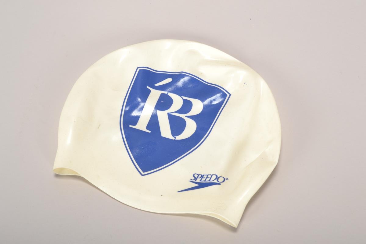 Hvít sundhetta með merki „ÍRB“ Íþróttabandalagi Reykjanesbæjar