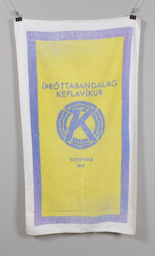 Gult, hvítt og blátt handklæði með bláum stöfum og merki; merkt ÍBK.