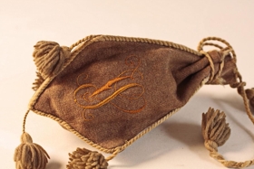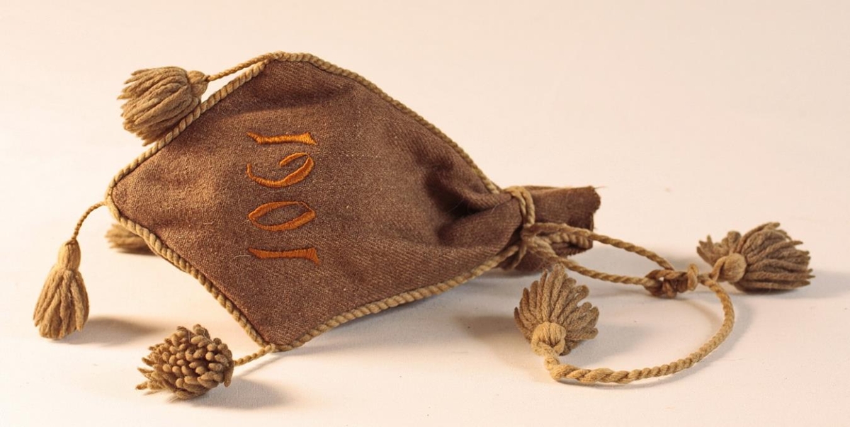 Tóbakspungur úr mórauðu vaðmáli - ullardúk, þriggja hliða. Lengd 23 cm. Mesta breidd 12 cm. Settur ljósum snúrum með dúskum á. Dreginn saman í „hálsinn". Útsaumaður með mislöngu spori á allar hliðar. Ein með blómamynstri í gulum, rauðum, ljósum og grænum litum. Ein hliðin er með ártalinu 1901 í gulum lit og sú þriðja með upphafsstöfunum JS, fallega samanvöfðum í gulum lit. Ekki oft verið notaður undir tóbak.