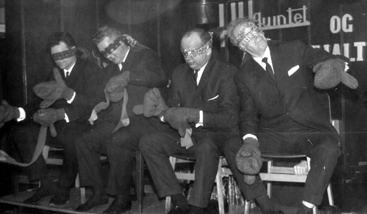 Árshátíð SKE 1965. Marga fiska hafa þeir Aðalsteinn, Mikael, Einar og Frímann úr sjó dregið, en að klæða sig í kvennmannssokk með bundið fyrir augun og þykka sjóvettlinga á höndum gekk miklu verr.