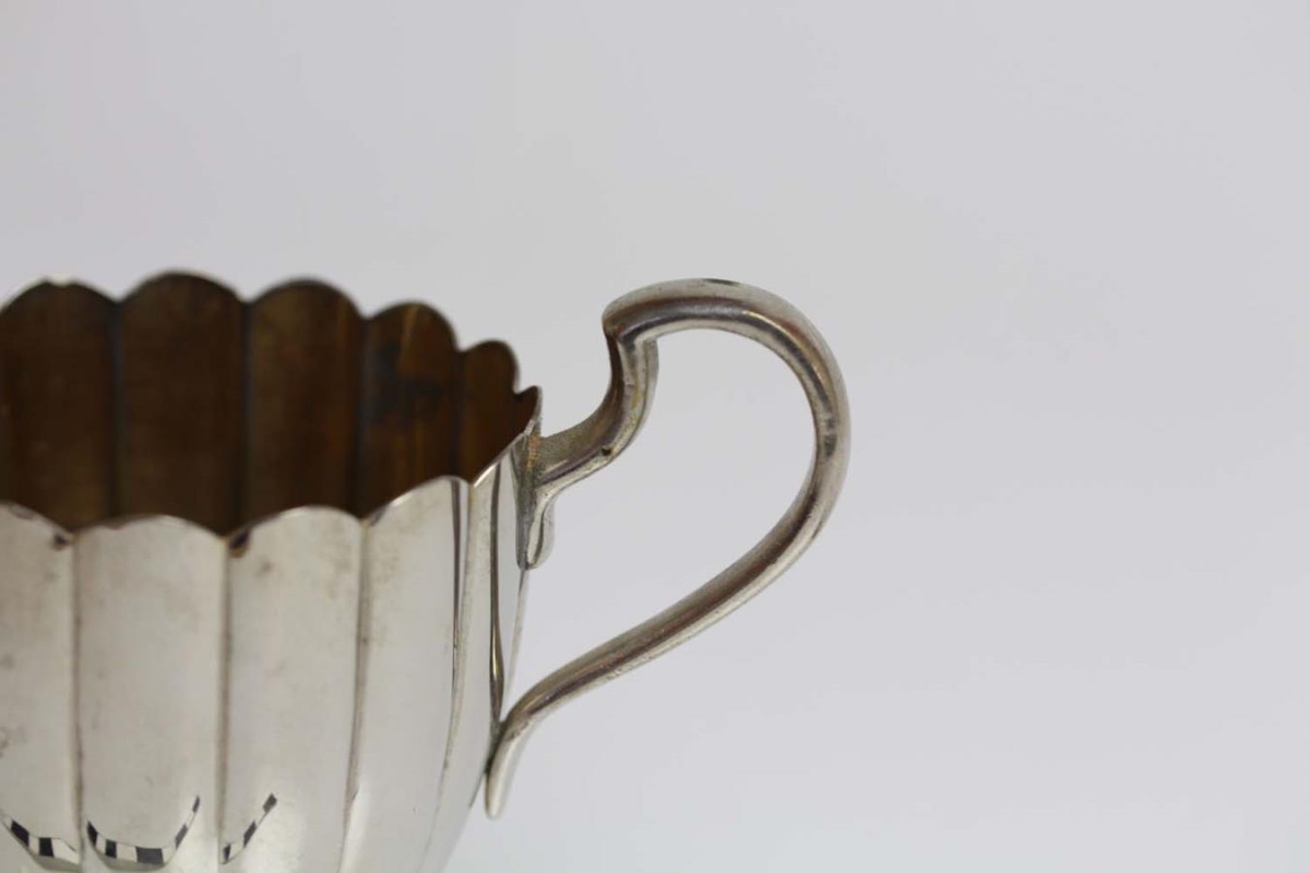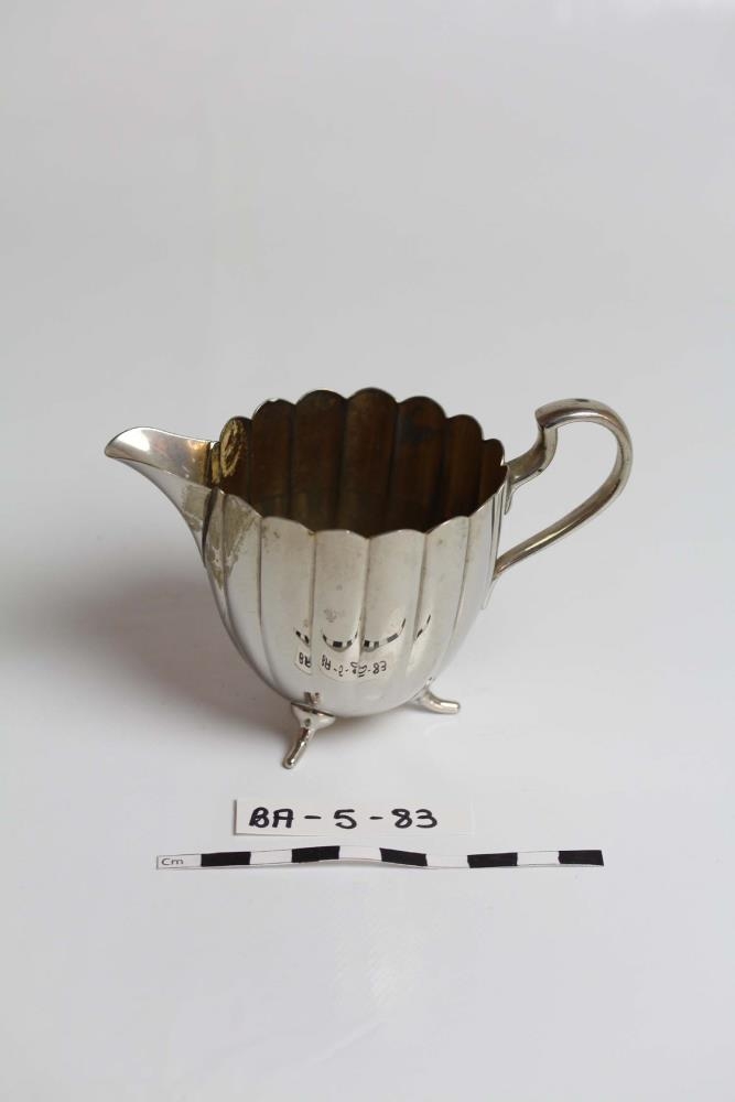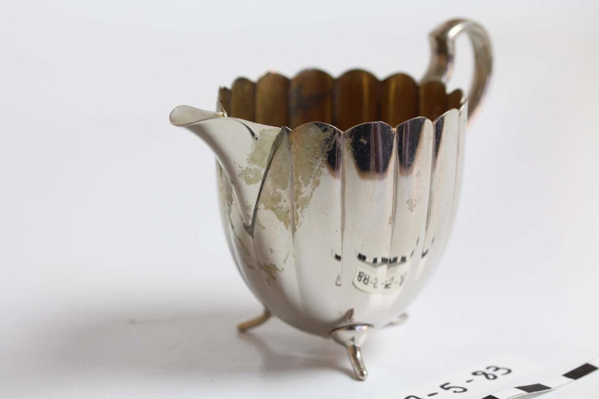 Silfurplatt mjólkurkanna. Stúturinn virðist hafa brotnað af og reynt hefur verið að líma hann á aftur, en öðru megin skilur hann sig enn frá könnunni sjálfri. Límið hefur farið mikið framan á könnuna.
