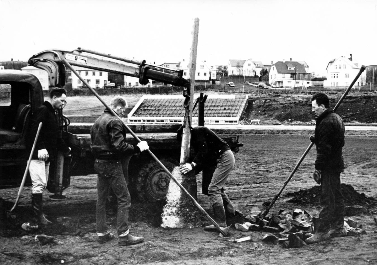 KA menn í girðingaframkvæmdum við Íþróttavöllinn á Akureyri.